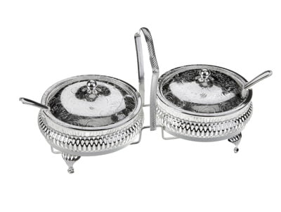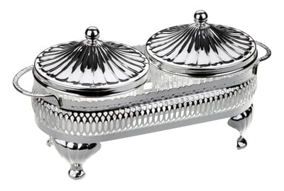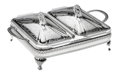 Queen Anne Double Casserole/Lids 6"h x 10"w 15"l English Silver Plate (Tarnish Resistant). SKU #: 0/6300.