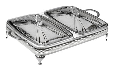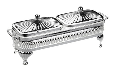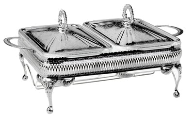 Queen Anne Large Double Casserole/Lids 6"h x 12 1/2"w x 19"l English Silver Plate (Tarnish Resistant). SKU #: 0/6307.