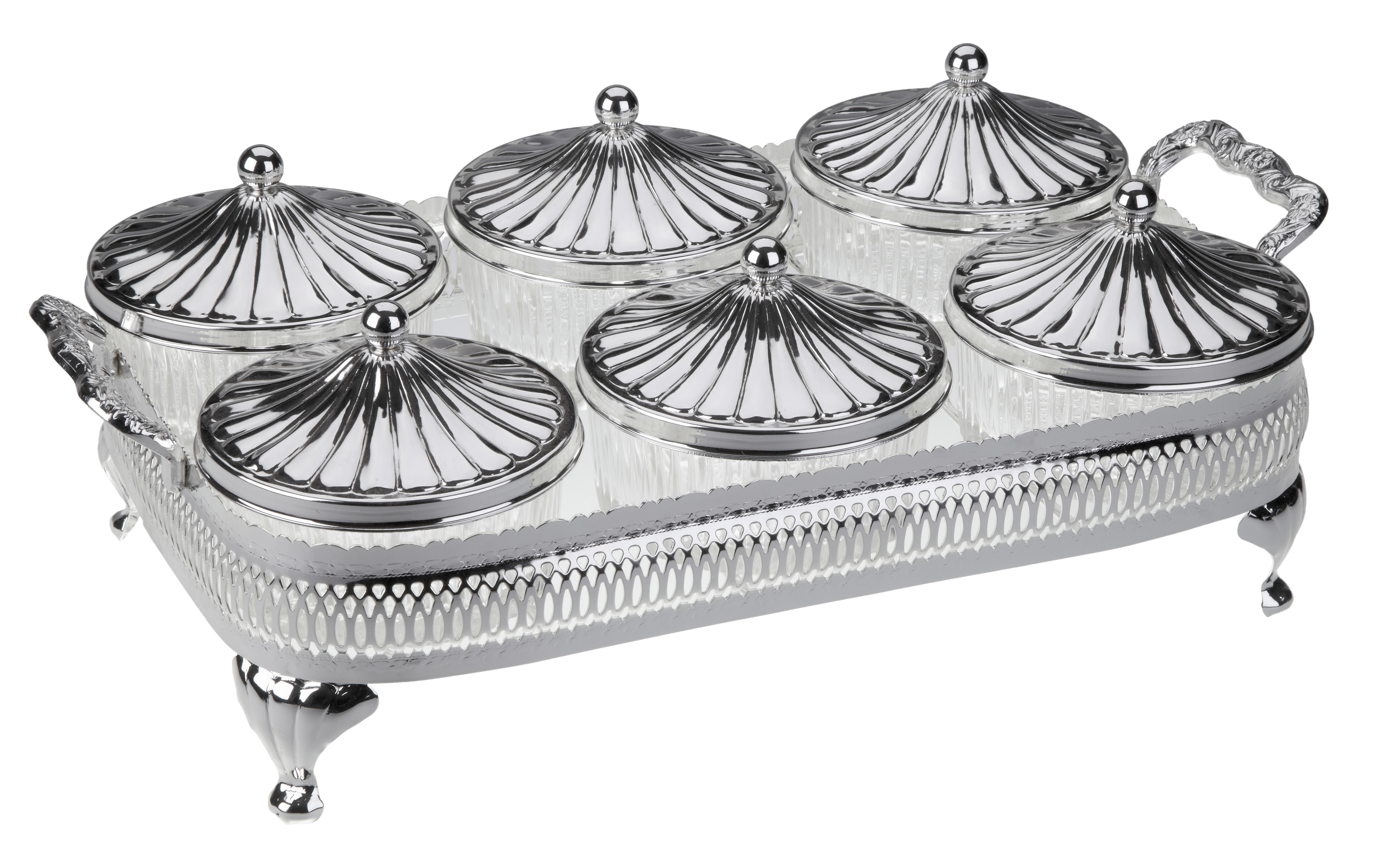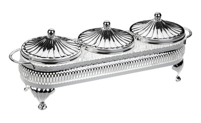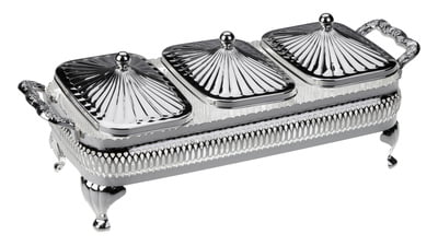 Queen Anne Triple Casserole/Lids 6"h x 10"w x 20 1/4"l English Silver Plate (Tarnish Resistant). SKU #: 0/6303.