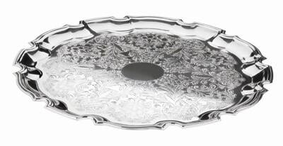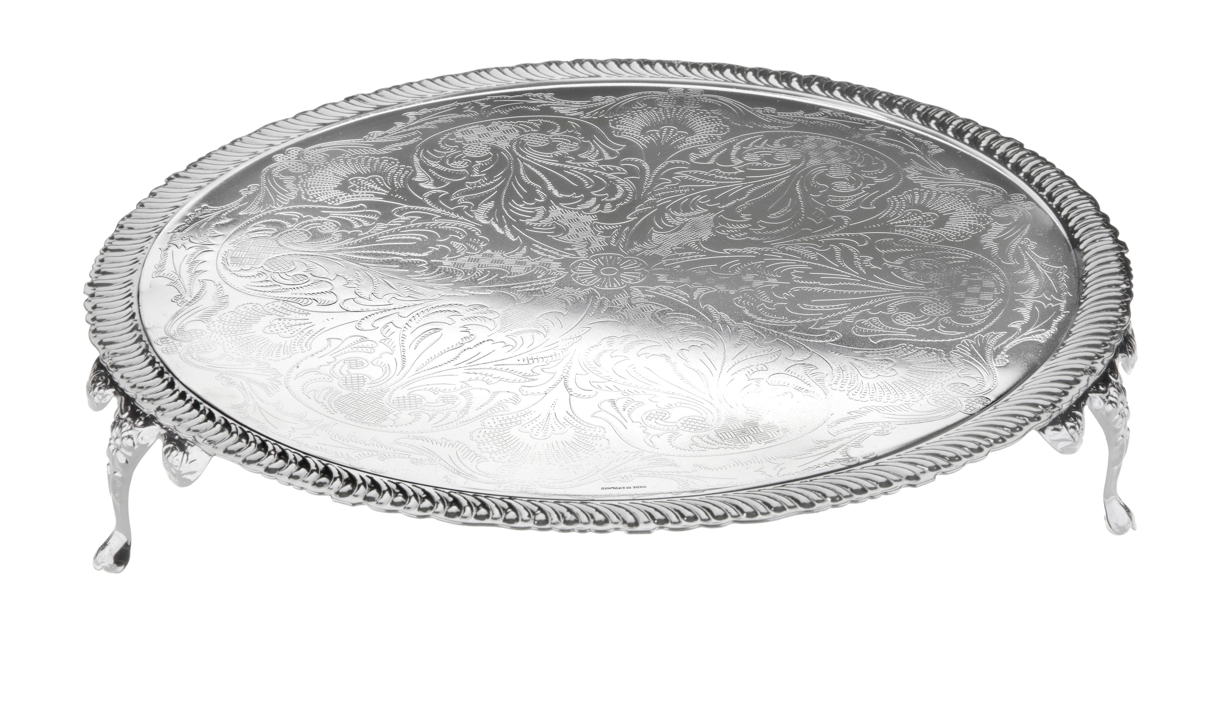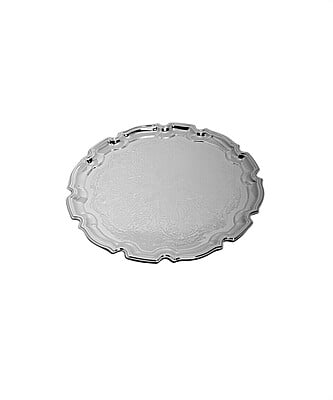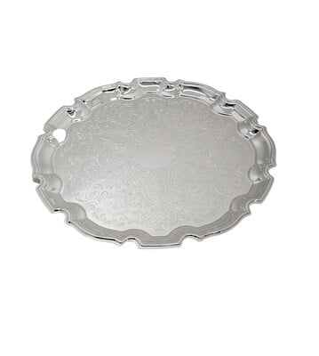 Queen Anne Medium Chippendale Tray 9 1/2"dia x 1/2"h English Silver Plate (Tarnish Resistant). SKU #: Q0/6181.