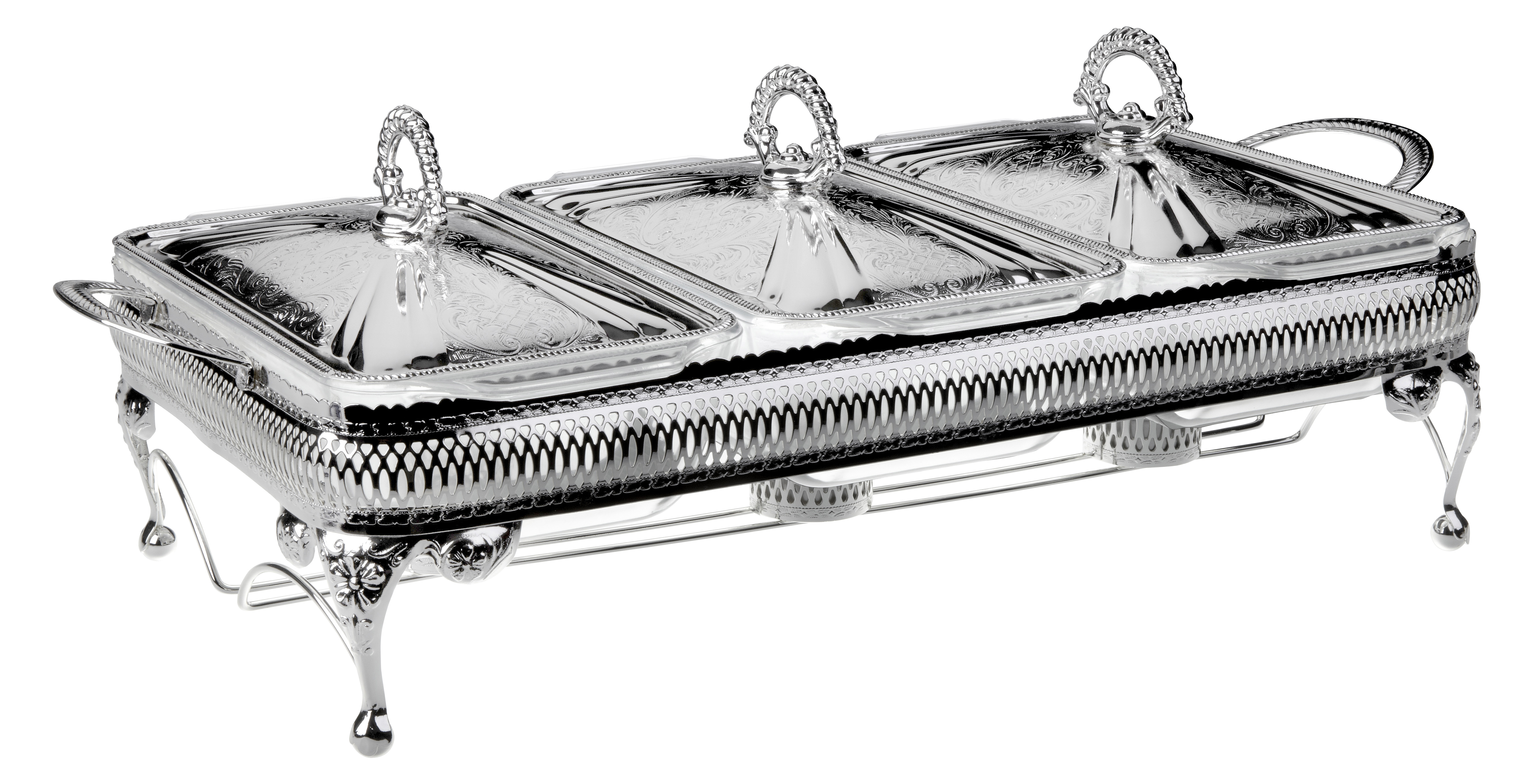 Queen Anne Triple Casserole/Warmers 7"h x 10 1/2"w x 20"l English Silver Plate (Tarnish Resistant). SKU #: 0/6283.