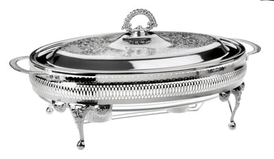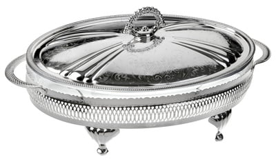 Queen Anne Medium Oval Casserole/Lid 6"h x 8 1/2"w x 13 1/8"l English Silver Plate (Tarnish Resistant). SKU #: 0/6291.