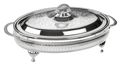 Queen Anne Oval Casserole/Lid/Warmer 7 1/4"h x 8 5/8"w x 13 3/4"l English Silver Plate (Tarnish Resistant). SKU #: 0/6292.