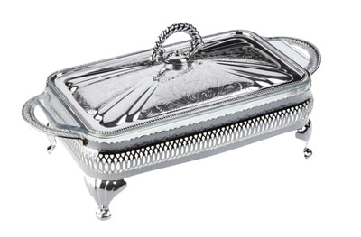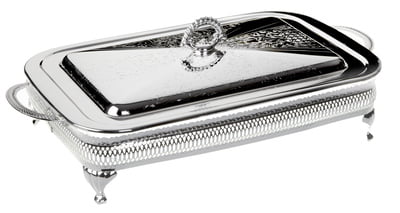 Queen Anne Large Oblong Casserole/Lid 6 1/2"h x 9 1/8"w x 18 1/8"l English Silver Plate (Tarnish Resistant). SKU #: 0/6297.
