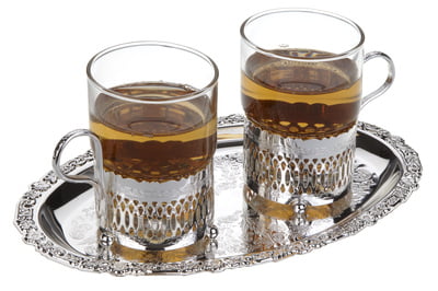 Queen Anne 6 Tea Glasses on Tray 3 7/8"h x 9 3/4"w x 13 1/2"l English Silver Plate (Tarnish Resistant). SKU #: 0/6324.