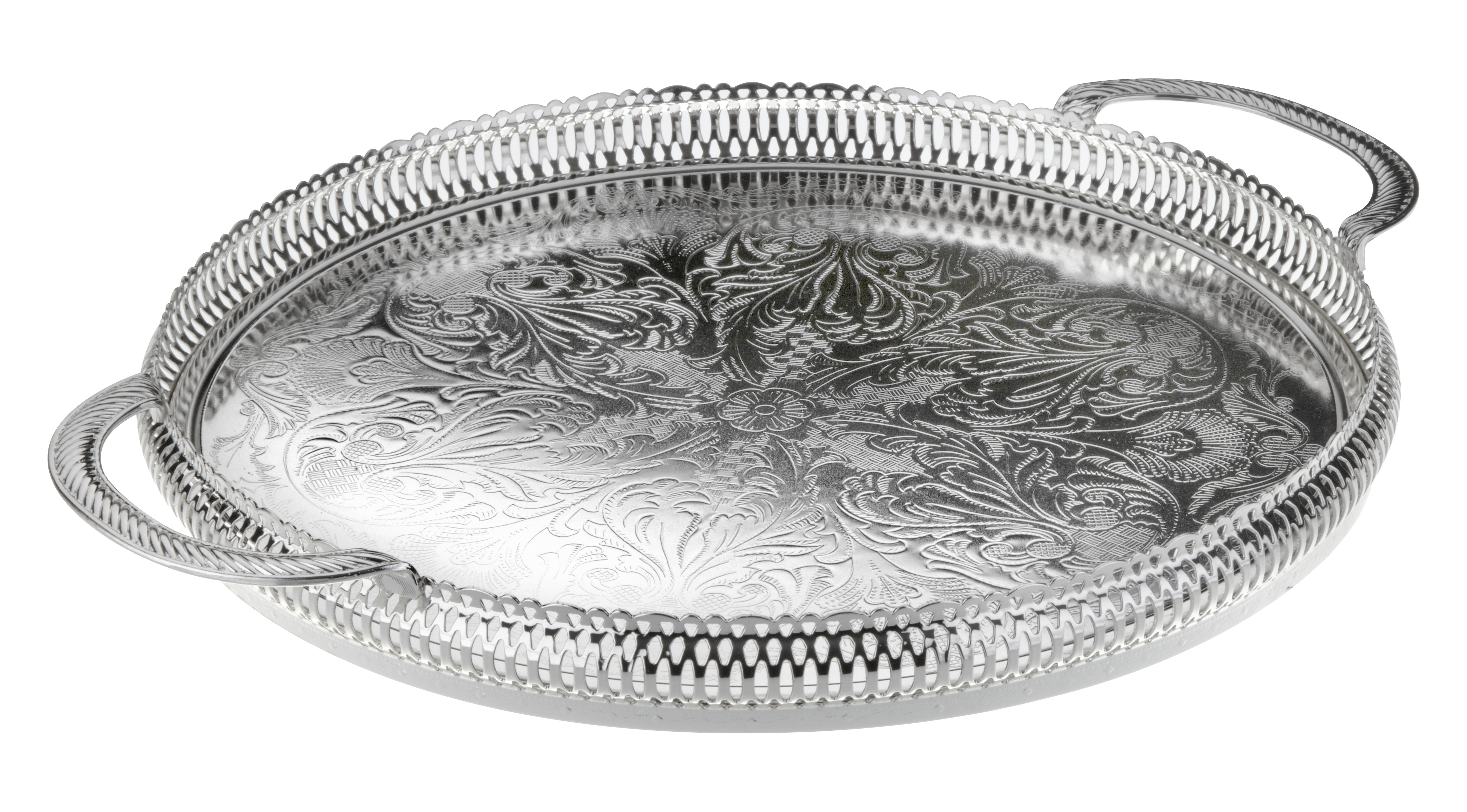 Queen Anne Gallery Tray/Handles Round 14"dia x 2"h English Silver Plate (Tarnish Resistant). SKU #: 0/6392.