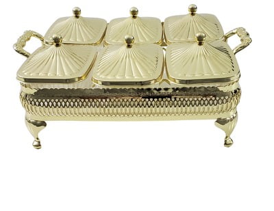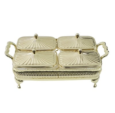 4 Pce Oblong Party Set.5"h x 7"w 12 1/4"l English Silver Plate Tarnish Resistant (Gold Finish). SKU #: Q4/4925.