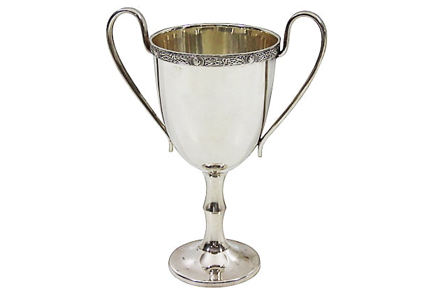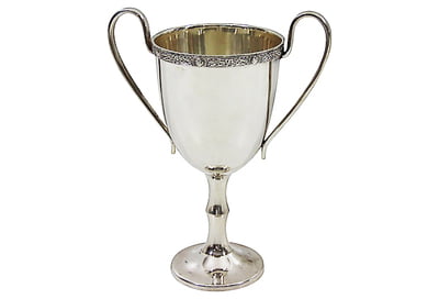 English silver-plate cup with Celtic border and curved handles, circa 1900.