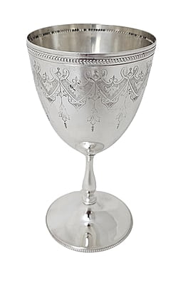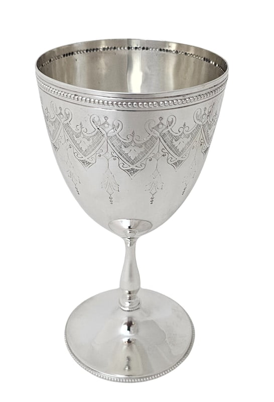This distinguished English Silver Plate goblet from around 1860 boasts a beautifully engraved design. Here are the details: