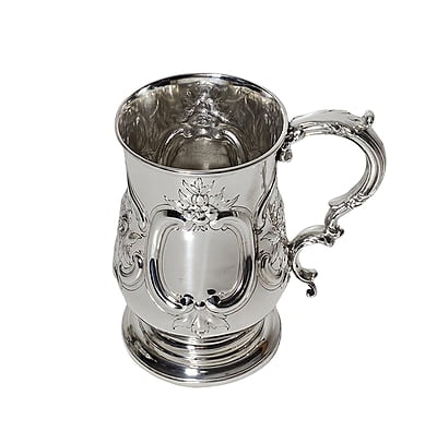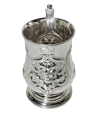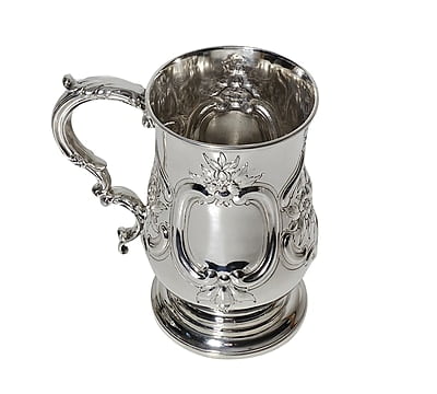 - Description: This impressive silver-plated tankard features intricate embossed patterns, adding texture and visual interest to its surface.
