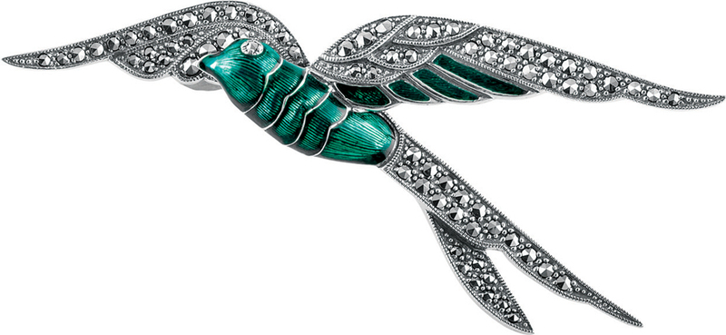 Brooch Swallow Green Enamel & Marcasite Set English Sterling Silver 1.25" x 3". SKU #: B389.