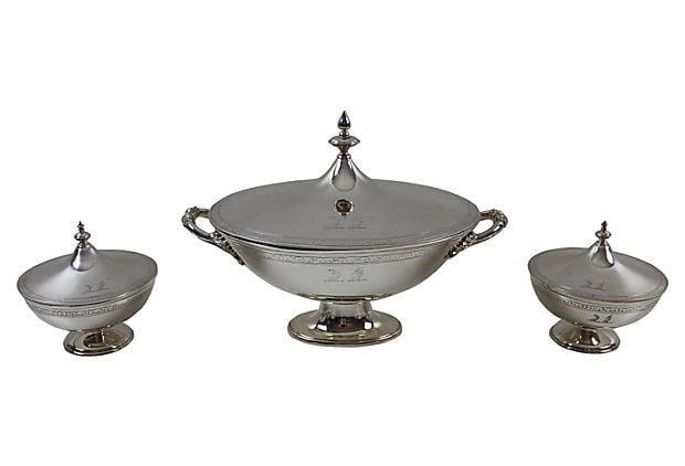 Soup tureen with two matching sauce tureens. Matching set that is oak crested with hand engraved rims.