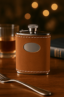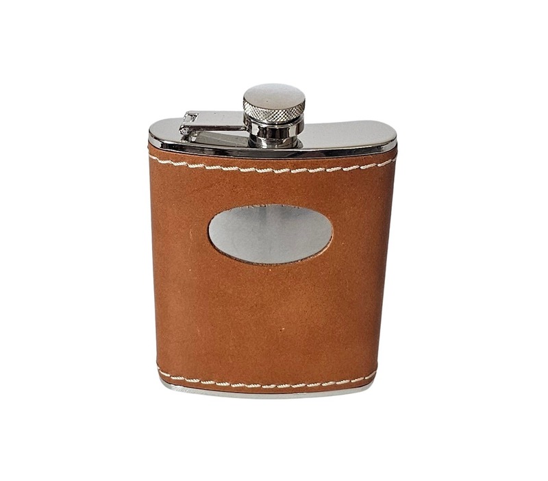 Hip Flask – Captive Top, Stitched Tan Leather & Stainless Steel (6 oz) A refined companion for celebratory moments, this 6 oz hip flask combines polished stainless steel with a warm tan leather wrap, detailed with crisp white stitching and a classic captive top. The oval cutout adds visual intrigue, revealing the gleam of metal beneath for a sophisticated contrast.