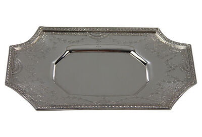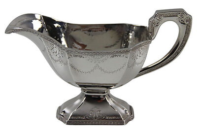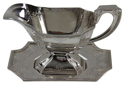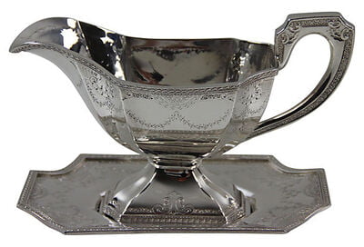 Engraved silver-plate sauce boat on tray. Made in the USA, circa 1900.