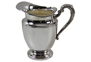 Water pitcher with gadroon border and round base. Made in England of silverplate circa 1950. Dimensions: 9"L x 5 1/2"W x 8 1/2"H.