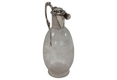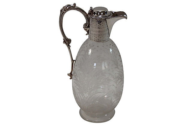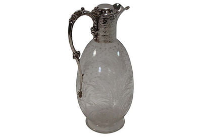 English Claret Jug with Etched Glass Detail, made in England, silver-plate c.1875.