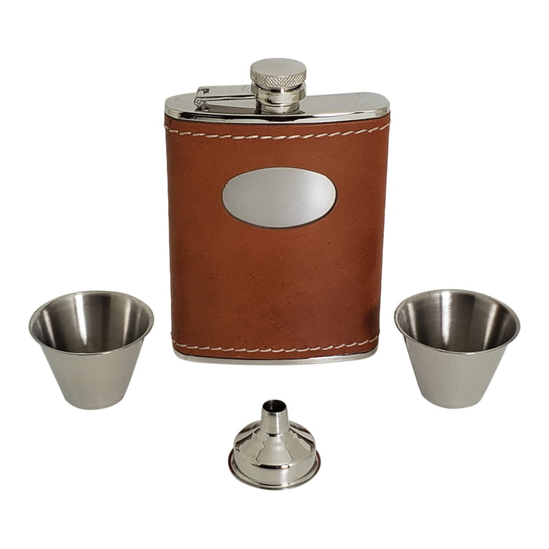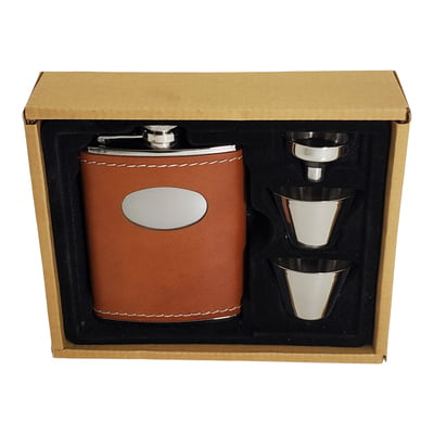 Stainless Steel Flask, Tan with Funnel & 2 Cups, Gift Boxed 6 oz