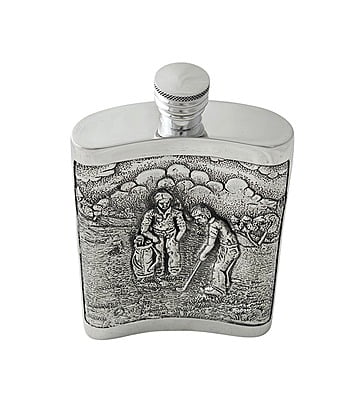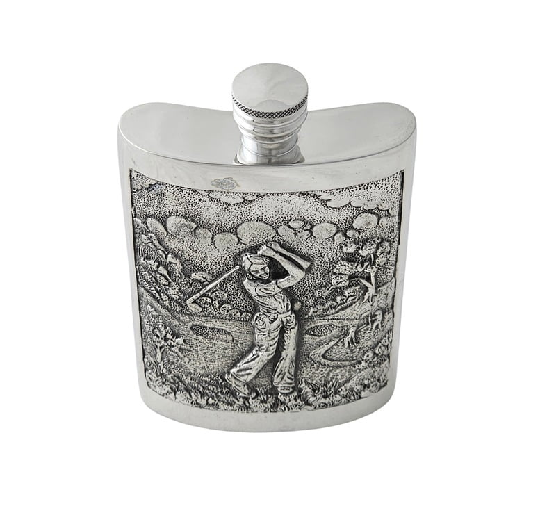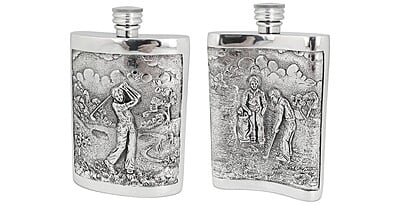 Double Sided Kidney Shaped Embossed Golf Design Pewter Flask 6oz , Boxed