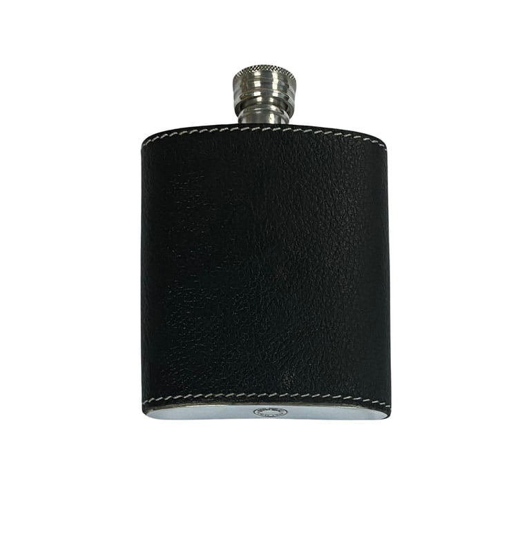 Pewter Black Leather Stiched Flask 6oz. SKU #: C3054.