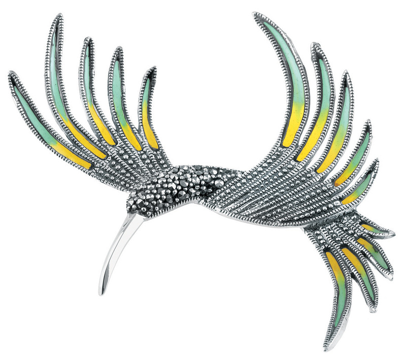 Brooch Hummingbird Yellow & Green Enamel & Marcasite English Sterling Silver 2" x 2.75". SKU #: B509.