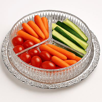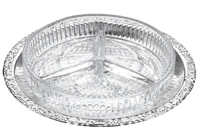 Silver Plated Floral Edged recessed Tray with 3 Division Round Patterned Hors d' Ouevre Glass