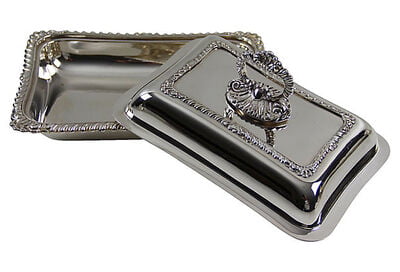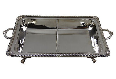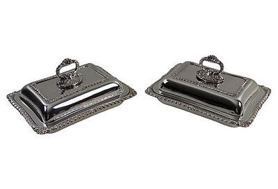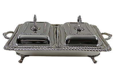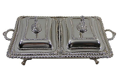 This pristine serving set has a pair of matching covered entree dishes that fit into a claw footed outer dish. Use as multiple open and closed servers or combine to use as a double covered entree. All of the edges are bordered in gadrooning and the handles swivel to separate for cleaning. c. 1880