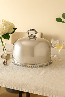 English Silver Plate Dome with Bead Edge Design, c.1860 This stately silver-plated food dome, dating to circa 1860, exemplifies Victorian refinement with its classic bead edge detailing and generous proportions. Measuring 16.5" x 11.5" x 11.5"H, it offers a commanding presence on any formal table or collector’s display. The smooth, polished surface reflects light beautifully, while the beaded border adds a touch of texture and sophistication. Traditionally used to cover roasts or game, this dome evokes the grandeur of 19th-century English dining rituals. Its balanced proportions and timeless silhouette make it equally suited for service or decorative use. Whether styled as a centerpiece or paired with complementary serving ware, this piece speaks to heritage, craftsmanship, and enduring elegance.