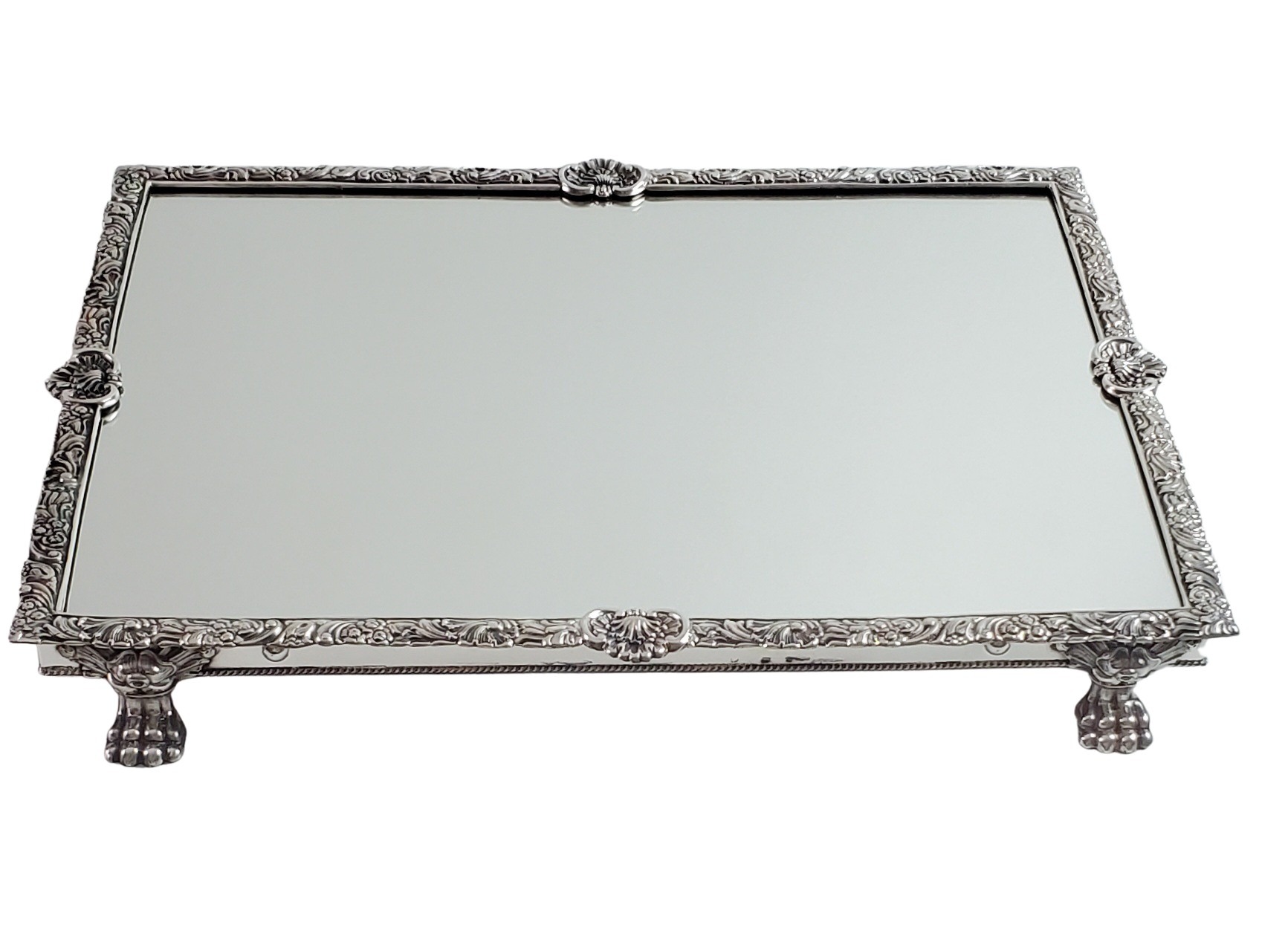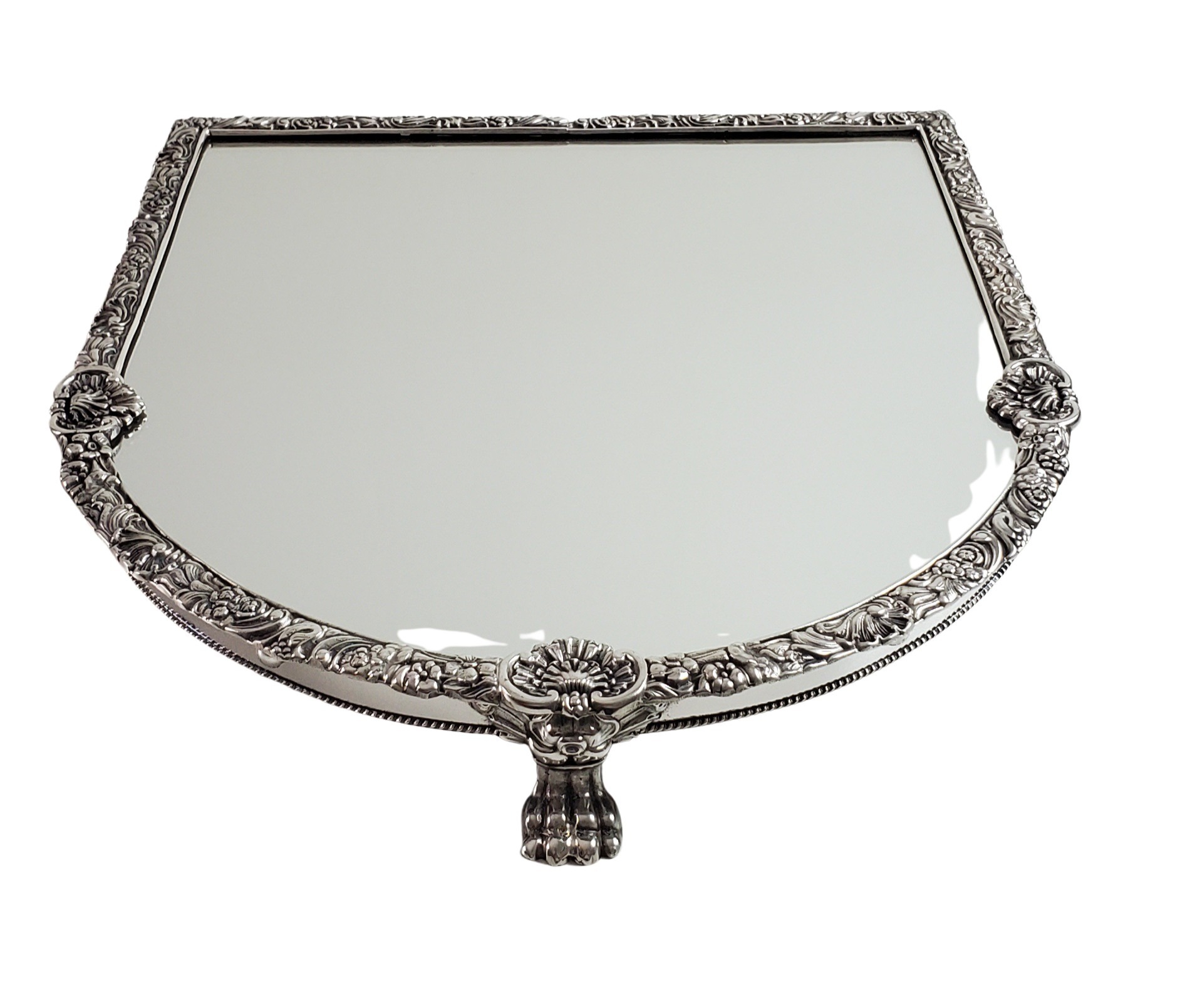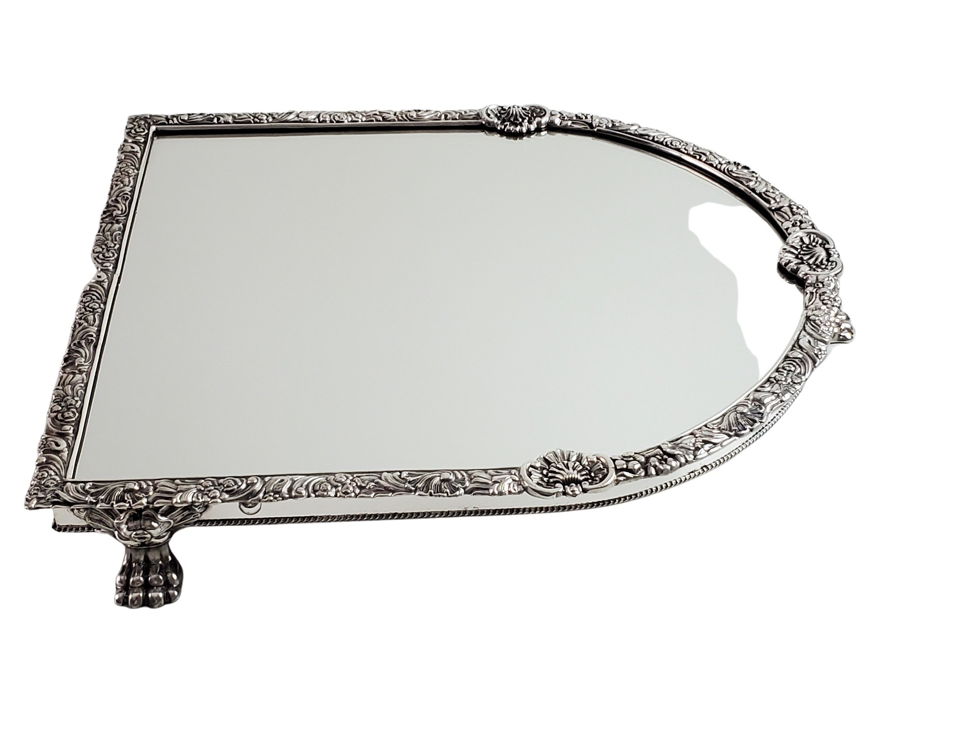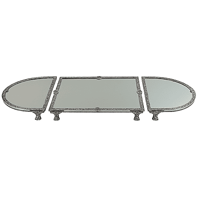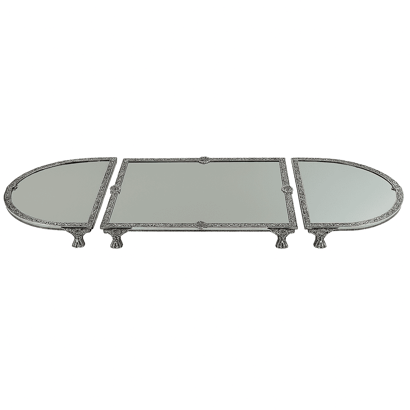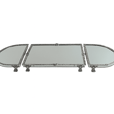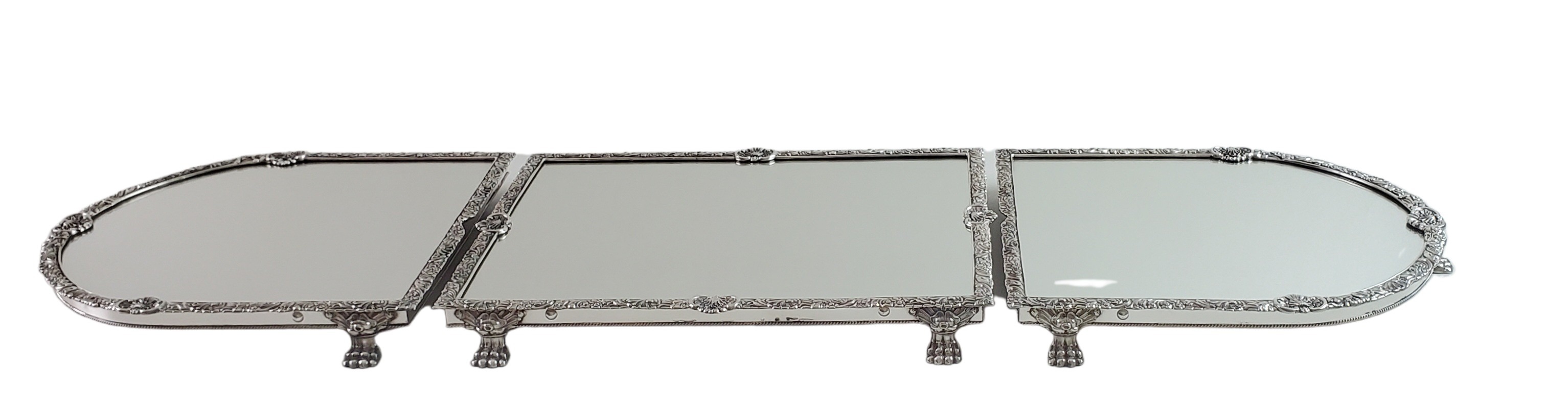 A 3 section silver plated plateau is a type of serving tray that consists of three separate pieces that can be arranged in different ways. It is usually made of a base metal with a layer of silver applied , and often has a mirrored base to reflect light and enhance the presentation of food or Candelabra, Epergne,s, Centerpieces ,Vases used to elaborate the item It is a great addition to any formal dining setting or special occasion.