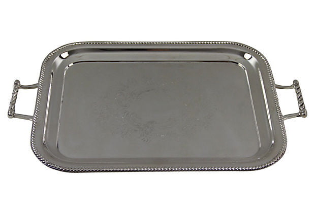 Rectangular engraved silver-plate tray with gadrooned edge and two handles. Made in England, circa 1890. 19.25"L x 12.25"W x 1"H