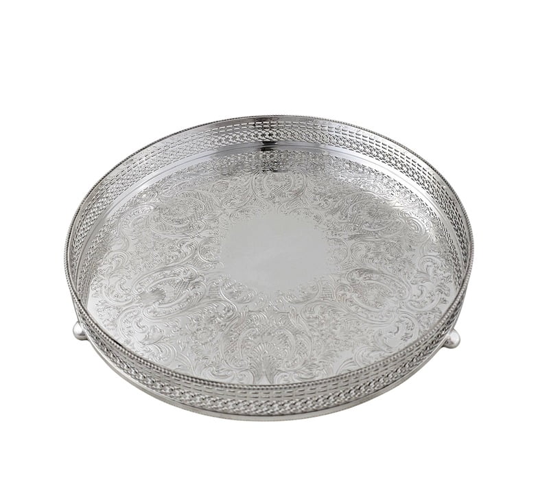 Round Engraved 12" Dia Gallery Tray on Ball Feet English Silver Plate c.1950