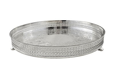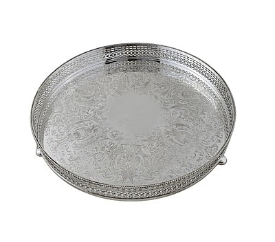 Round Engraved 12" Dia Gallery Tray on Ball Feet English Silver Plate c.1950. SKU #: ANT3000.
