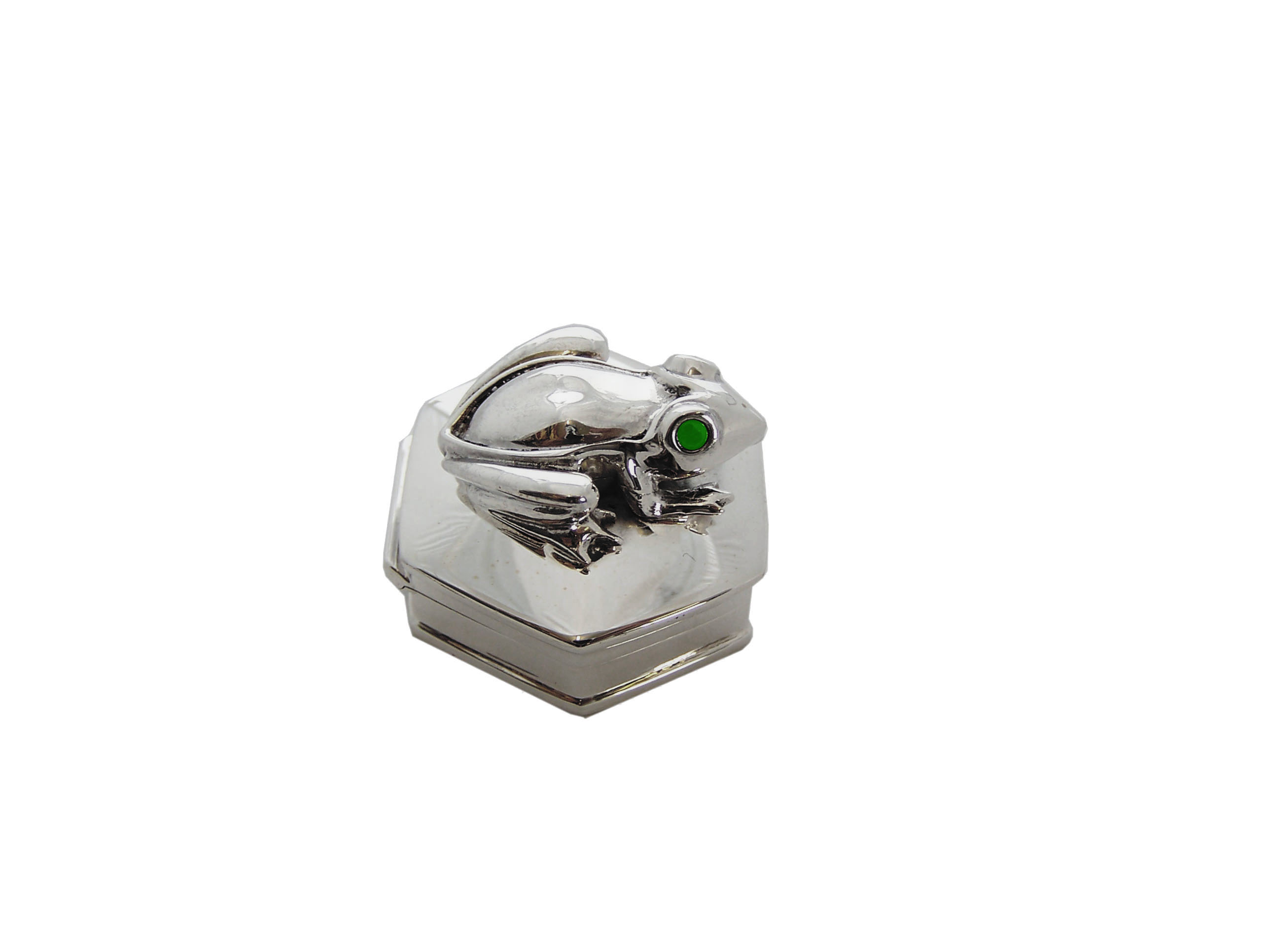 Pillbox 6 Sided Has Frog on Top with Ruby Eyes 1.25" Diameter English Sterling Silver. SKU #: PB611.