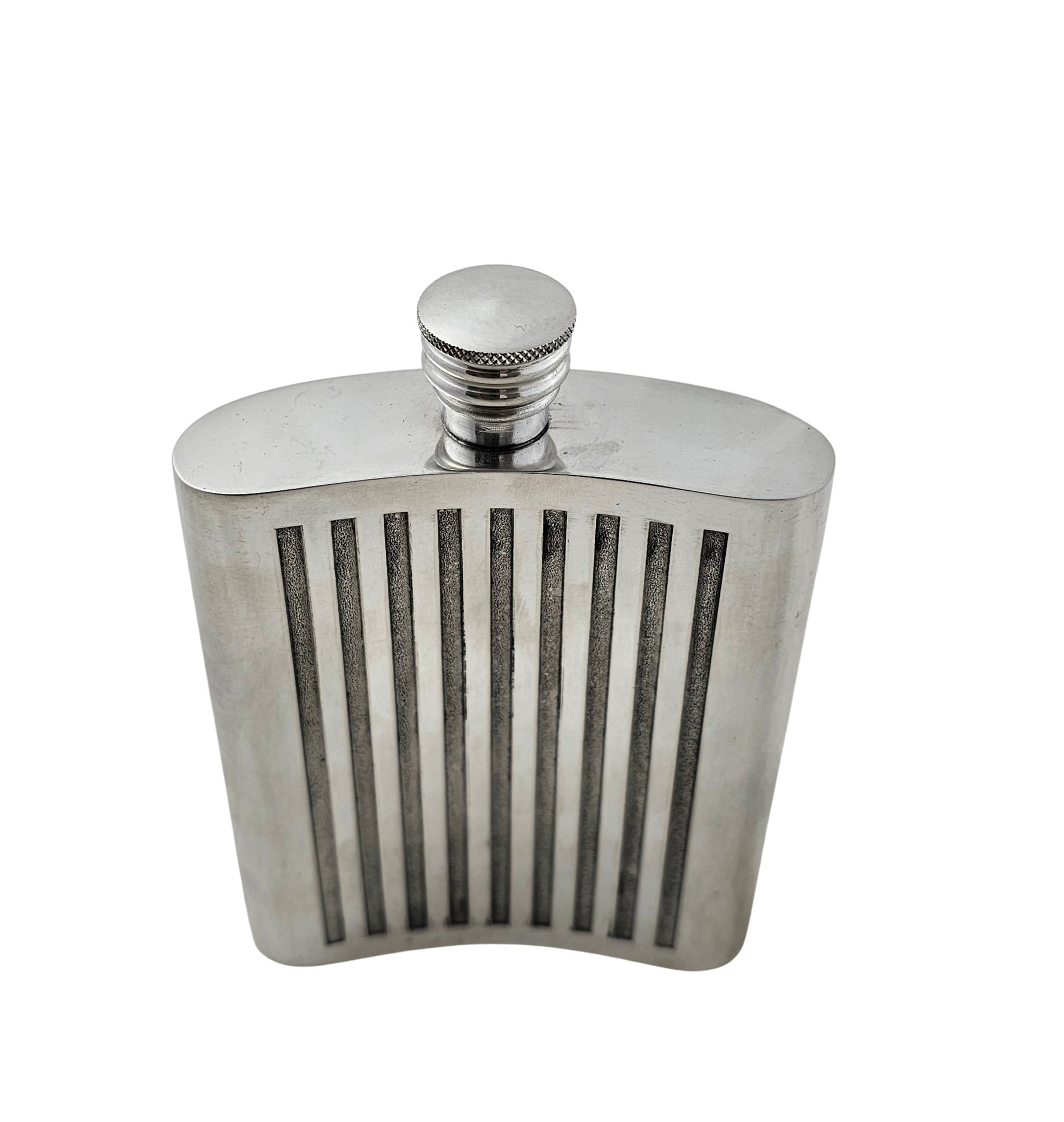 Ribbed Design Flask With Cartouche 6oz Pewter Boxed With Pouch. SKU #: C1738.