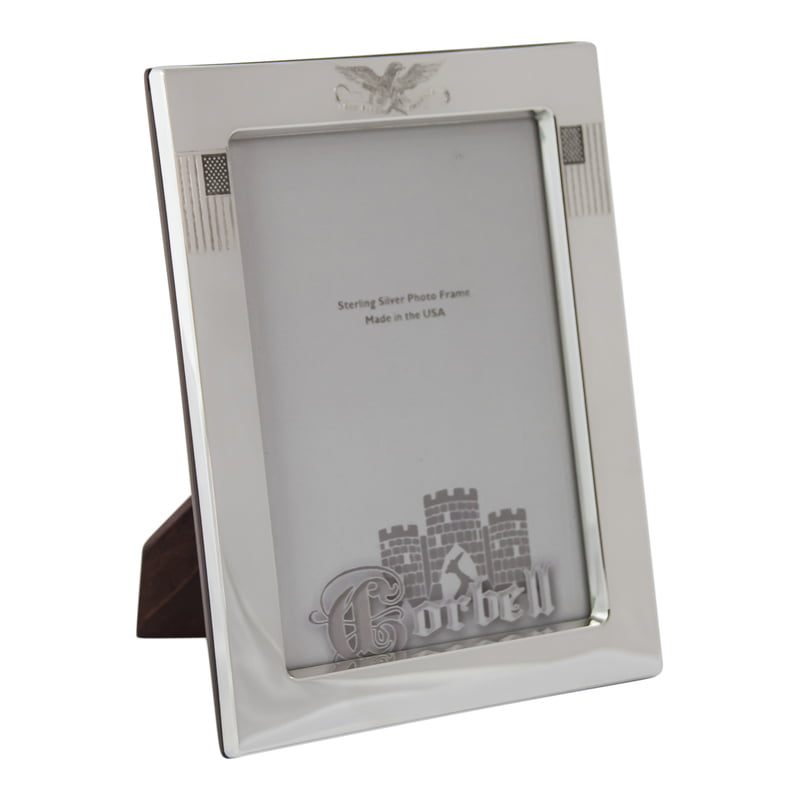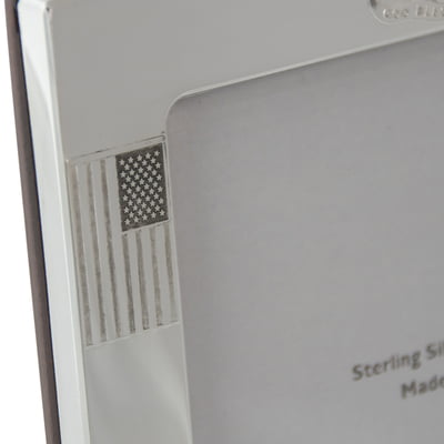 Celebrate patriotism with our Sterling Frame in the American Spirit Design. This exquisite frame features the words "GOD BLESS AMERICA" highlighted prominently, with an American flag in each top corner. Crafted from thick sterling silver, the frame offers ample space for hand or laser engraving, allowing for personalized touches. The back of the frame is finished with a rich rosewood easel, adding a touch of elegance. Available in two sizes, 5" x 7" and 8" x 10", this frame is perfect for showcasing cherished memories with a patriotic flair.