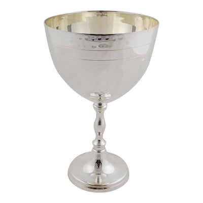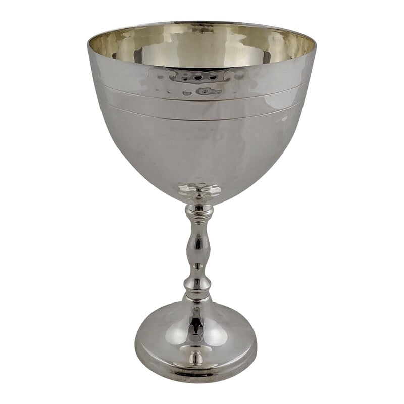 Hammered Silver-Plated Goblet/Chalice Elevate any occasion with our exquisite hammered goblet, crafted from high-quality silver plate. Standing at an impressive 9.25 inches tall and 5.5 inches in diameter, this piece commands attention with its timeless elegance and refined details. Featuring a 1/4-inch engraving band encircling the design, it offers the perfect opportunity for personalization—making it an ideal choice for commemorations, gifts, or ceremonial use. A stunning blend of beauty and functionality, this goblet is a true testament to artisanal craftsmanship.Hammered 9.25"h Chalice Cup Silver Plate