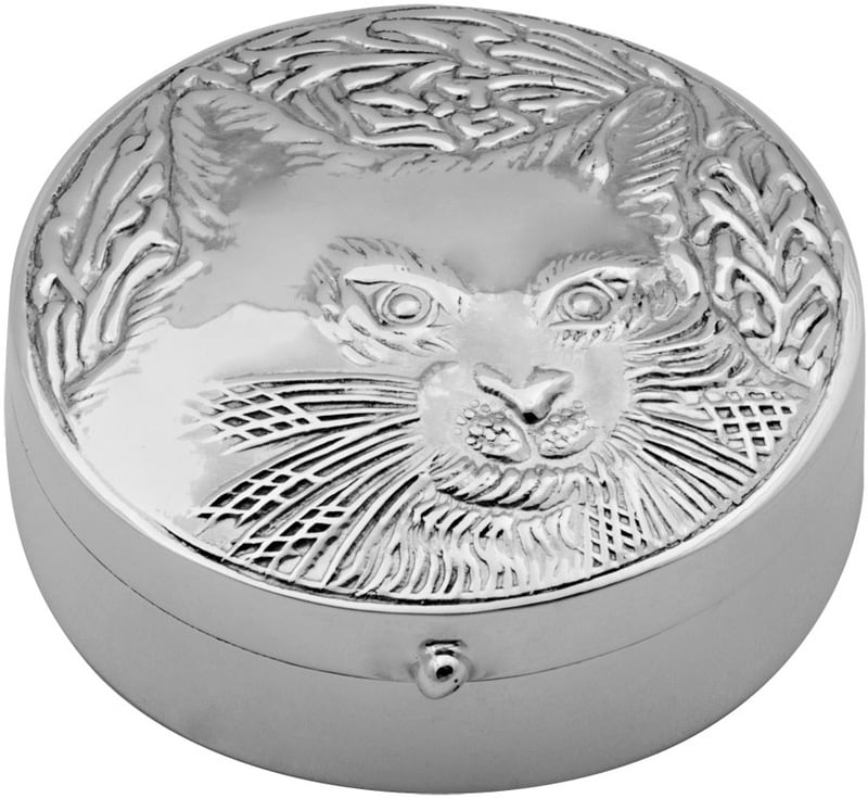 Rounded in shape, these embossed Pill Boxes features an intricate detailed design on the lid with the beautiful face of a cat, with plain sterling silver sides. This pill box makes for a wonderful and special gift or keepsake. Made from premium quality hallmarked sterling silver, this pill box is hand finished and polished to achieve the highest standards.