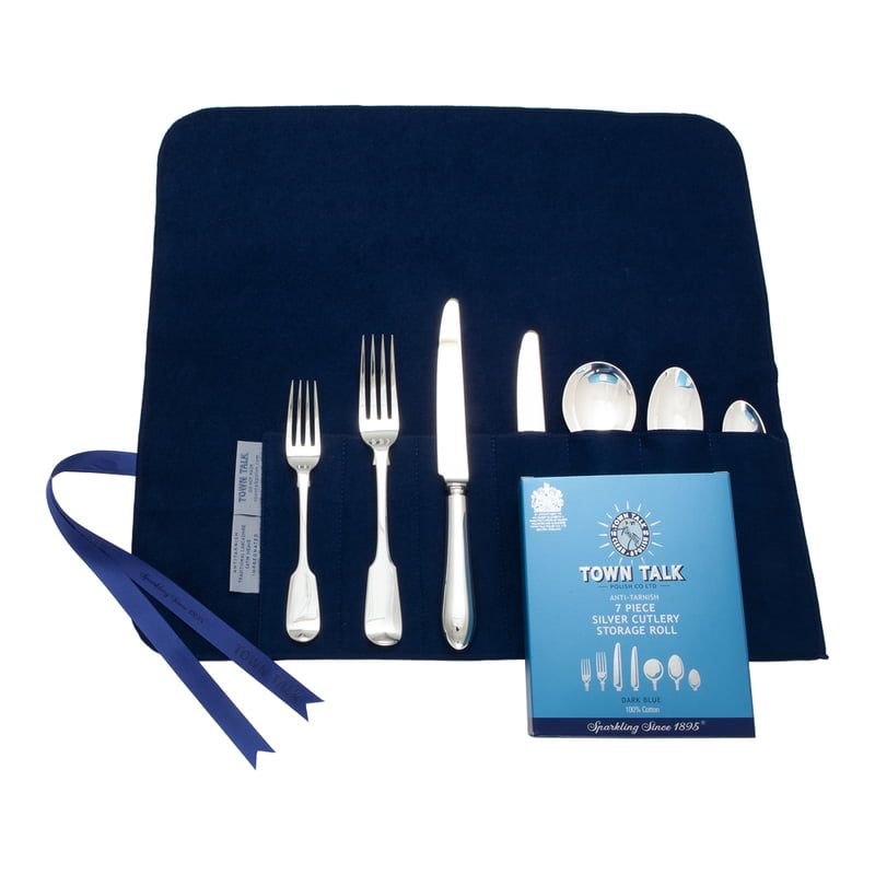 With an individual pocket for each item, this storage roll will keep up to 7 items of silver cutlery sparkling bright and safe from knocks and scratches. It’s made from special anti-tarnish fabric, which will retain its protective properties as long as it is not washed.