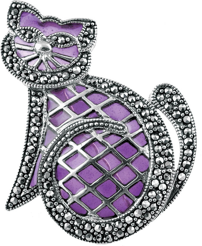 Brooch Cat Purple Enamel & Marcasite English Sterling Silver 1 3/4" x 1 3/8". SKU #: B642.