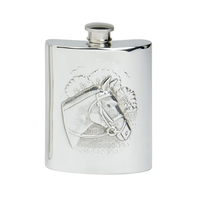 This 6oz English pewter flask features an intricately engraved horsehead design, capturing the spirit and elegance of equestrian artistry. The flask comes with a convenient pullstring pouch for protection and is presented in a sophisticated black box, making it a perfect gift or addition to any collection.