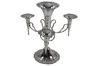 Fresh flowers were an essential part of the décor in nearly every Victorian English household in the 1800s. Flower epergnes, with varying numbers of spills, were a popular way of displaying them. Corbell is fortunate to offer this exquisite piece featuring a large center vase and four spills, making it a stunning centerpiece.
