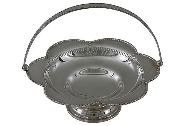 Footed silver-plate basket with swing handle and scalloped, pierced design. Made in England, circa 1900.