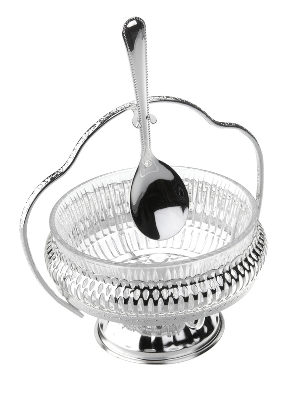 Silver Plated Gallery Frame on Base, with Handle and Spoon Holder, with Patterned Glass Dish and Silver Plated Spoon 5 5/8" x 5" |