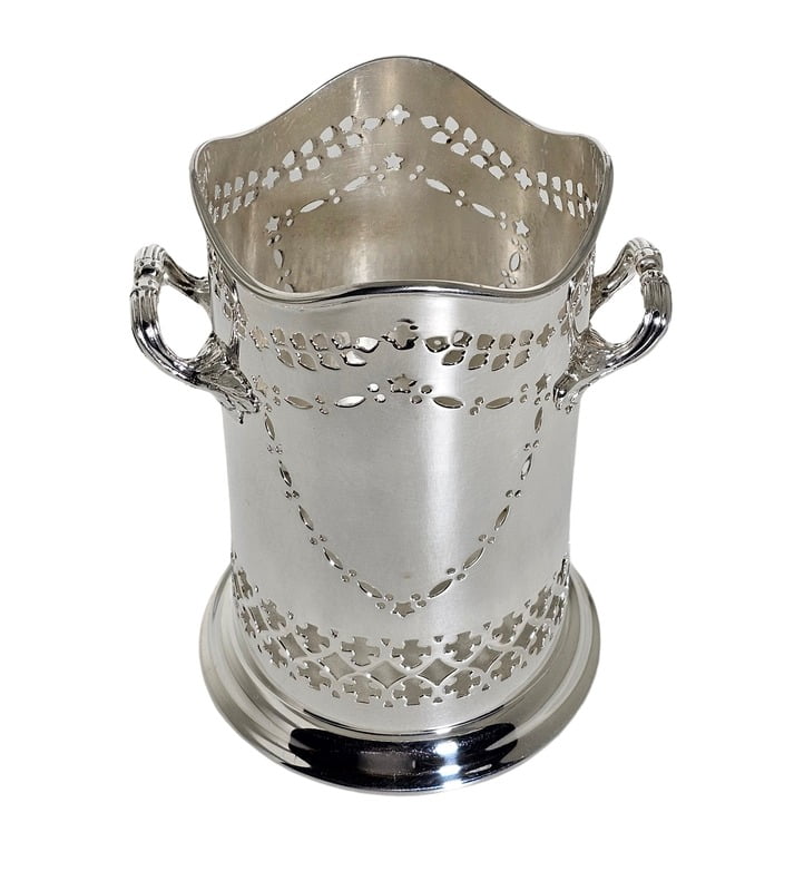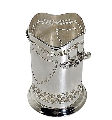 A silver plate syphon stand is a type of holder for a glass bottle that originally contained carbonated water or soda. Syphons were popular in the 19th and early 20th centuries as a way of dispensing fizzy drinks at home or in bars. A syphon stand is usually made of metal, often silver or silver plated, and has a circular opening at the top to fit the base of the bottle. The stand may have handles, feet, or a pedestal to make it easier to carry or display. The stand may also have decorative features, such as piercing, engraving, or motifs.