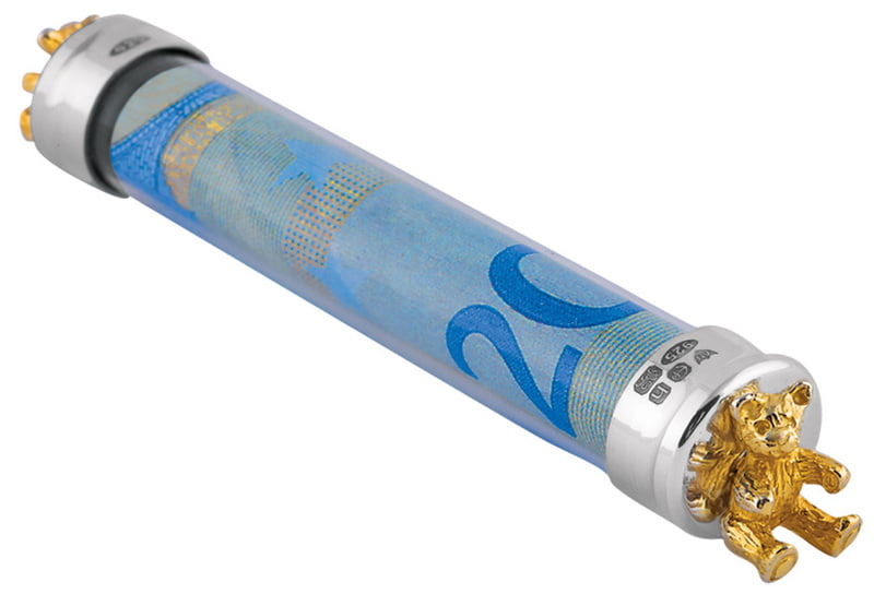 A thoughtful, unique child’s gift that can be kept and treasured as a family keepsake. Crafted to the highest standards from British hallmarked sterling silver and a toughened glass, this mesmerising money tube is finished off with a gorgeous gold plated teddy bear at either end. Designed in London and made in England, this perfect Christening or Baptism gift can hold a money gift too.