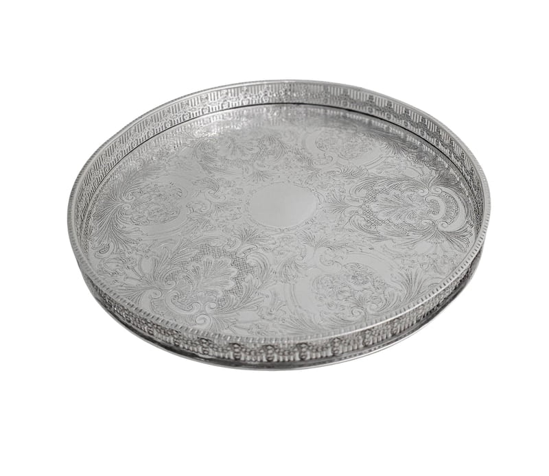 Tray with Pierced Gallery Engraved with Center Cartouche English Silver Plate c.1940.