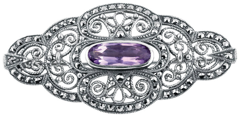 Brooch Oval Amethyst Center Stone and Marcasite Sterling Silver 1 1/8" x 2 3/8". SKU #: B285.