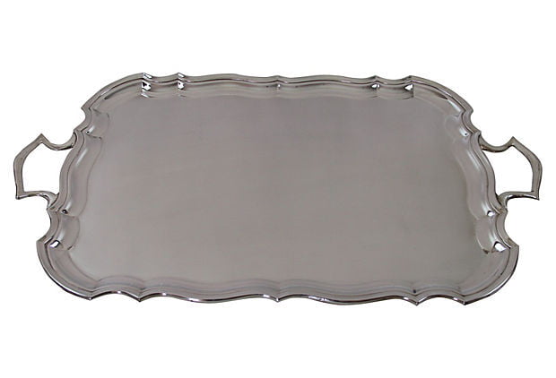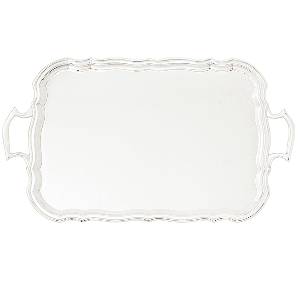 English Chippendale rectangular silver plate tray with handles. Made in England, circa 1890.