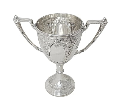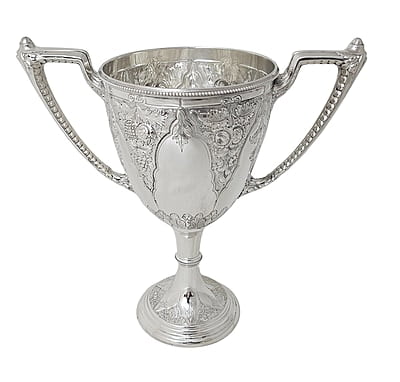 Cup,2 handle Embossed 10.5"h English Silver Plate c.1875.