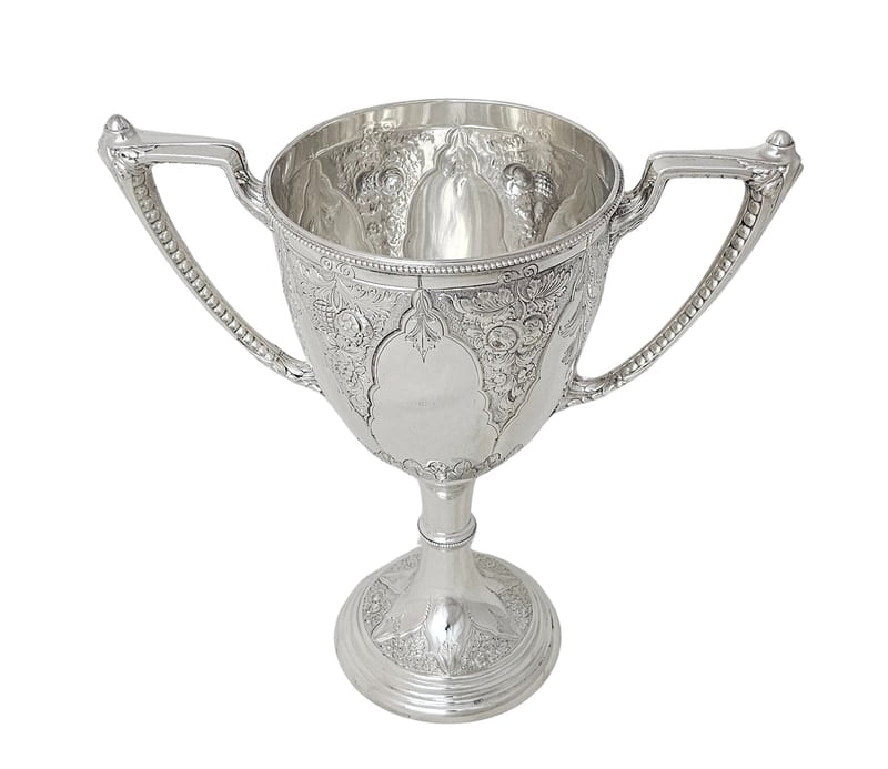 Cup,2 handle Embossed 10.5"h English Silver Plate c.1875.SKU:ANT3943