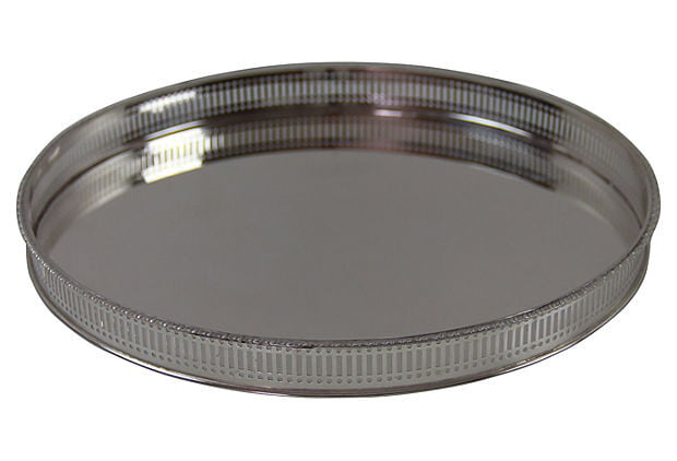 Round pierced silver-plate gallery tray. Made in England, circa 1960